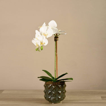 أضف عنصر الرقي إلى منزلك. تم صنع ترتيب الأوركيد المذهل هذا يدويًا باستخدام تقنية اللمس الحقيقي للحصول على تأثير نابض بالحياة بشكل ملحوظ. وعاءها الأخضر المزخرف يكمل بشكل جميل بتلات الحرير والأوراق الخضراء المورقة.