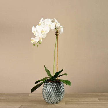 أضف الطعم والملمس إلى منزلك مع ترتيب الأوركيد المذهل هذا. مصنوعة يدويًا من قبل بائعي الزهور الخبراء باستخدام تقنية اللمس الحقيقي ، تبدو هذه الأوركيد المزيفة نابضة بالحياة بشكل مذهل. إن وعاءهم الأزرق المزخرف بأومبري يكملهم بشكل جميل.