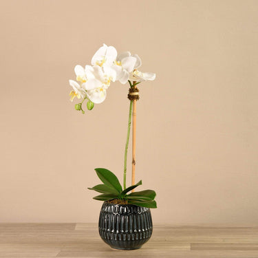 غني بالطابع الغريب ومع ذلك أنيق، يتميز هذا التنسيق الرائع من الأوركيد بمظهر وملمس واقعي مذهل بفضل تقنية الملمس الواقعي (Real-touch). يضفي الأصيص الرمادي الداكن ذو الملمس المميز بروزاً جميلاً للأوراق الخضراء الكثيفة.