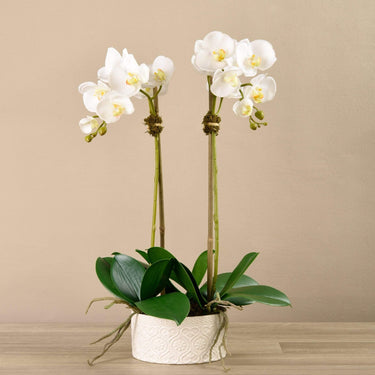 تشكيلة زهور الأوركيد في مزهرية خزفية
