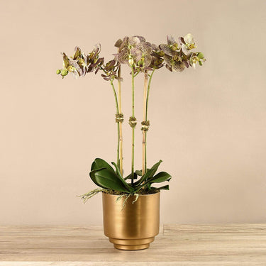 هذه الأوركيد الاصطناعية أنيقة وذات ذوق غريب. مصنوعة يدويًا بتقنية اللمس الحقيقي ، تبدو هذه الزهور الاصطناعية حقيقية بشكل مذهل من البتلات إلى الجذور. يضيف وعاءهم المعدني المصنوع من الذهب الداكن لمسة راقية.