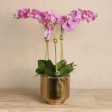 هذه الأوركيد الاصطناعية أنيقة وذات ذوق غريب. مصنوعة يدويًا بتقنية اللمس الحقيقي ، تبدو هذه الزهور الاصطناعية حقيقية بشكل مذهل من البتلات إلى الجذور. يضيف وعاءهم المعدني المصنوع من الذهب الداكن لمسة راقية.