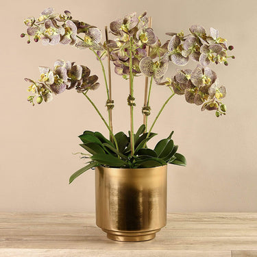 هذه الأوركيد الاصطناعية أنيقة وذات ذوق غريب. مصنوعة يدويًا بتقنية اللمس الحقيقي ، تبدو هذه الزهور الاصطناعية حقيقية بشكل مذهل من البتلات إلى الجذور. يضيف وعاءهم المعدني المصنوع من الذهب الداكن لمسة راقية.
