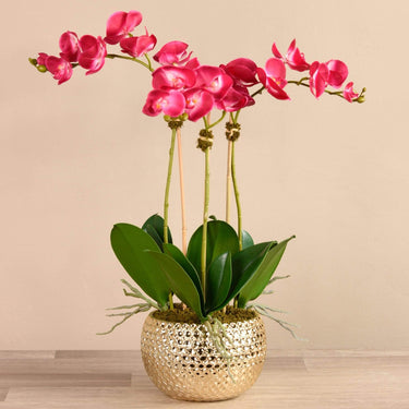 تشكيلة من زهور الأوركيد الحريرية البديعة من بلومر، منسقة داخل أصيص سيراميكي باللون الذهبي، لتحول منزلك إلى قصر فاخر يليق بالأميرات. يمكنك وضع هذه التشكيلة على طاولة الطعام أو فوق المدفأة للاستمتاع بسحرها الذي لا يفنى.