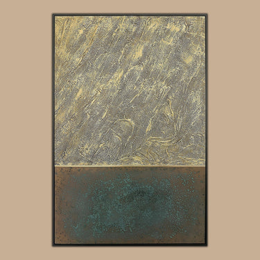 عزّز جمالك مع هذه التحفة الفنية ذات الإطار الأسود. القماشة تنبض بالحياة بفضل صفيحة معدنية سائلة، وقاعدة طلاء، وشريط ذهبي على شكل حرف T، لتُضفي مشهدًا بصريًا ديناميكيًا، فنًا معاصرًا آسرًا بعمقه وتركيبه.