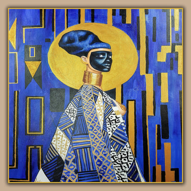 اخضِ رحلة بصرية مع هذه اللوحة الحديثة المطبوعة بتقنية الأشعة فوق البنفسجية، حيث تتصدر امرأة ذات حضور مهيب المشهد، معبّرة عن أناقة خالدة. مستوحاة من تأثيرات فن الديكو وثقافة أفريقيا الغنية، تُظهر اللوحة المرأة مرتدية عباءة ملونة بتصميم فسيفسائي نابض بالفخامة.
