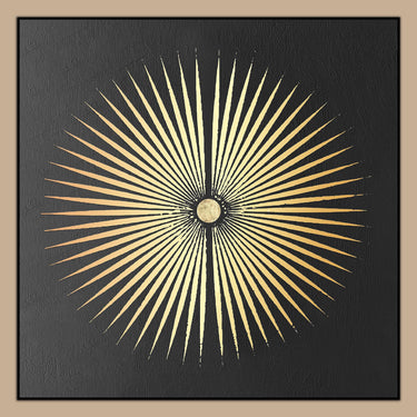 يمنح اللون الذهبي المتألق أجواءً ساحرة لهذا العمل الفني المطبوع بتقنية UV. يمتزج التصميم العصري مع الألوان المضيئة والعناصر المتناسقة بعناية ليشكل قطعة مذهلة مستوحاة من أشعة الشمس، تضفي لمسة جمالية على مختلف أنماط الديكور الداخلي.