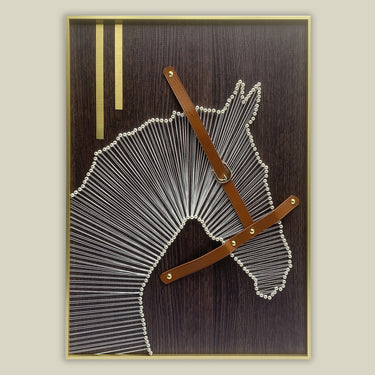 مصنوع من الخيط والجلد، ينهض حصانٌ رائع بكل جلاله في هذا العمل الفني المميز. من خلال دمج الحبال والجلد ولمسات من الذهب، تتجسد رؤية عصرية لرأس الحصان تجسد جوهر القوة والأناقة. مثالي لتزيين مكتب منزلي، أو غرفة بطابع فروسية، أو مكتبة دافئة، ليضيف لمسة فريدة ومميزة إلى أي مساحة.