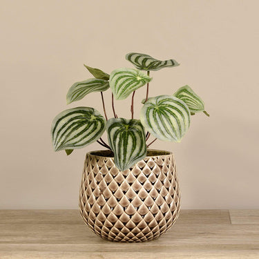 نبتة البيبيروميا، رمز الصداقة والحظ، التي تتميز أوراقها بشكلها المخطط الفريد. تأتيك من بلومر بمظهر وملمس طبيعيين للغاية، داخل أصيص بني فاتح بديع مزخرف بتصميم شبكي.