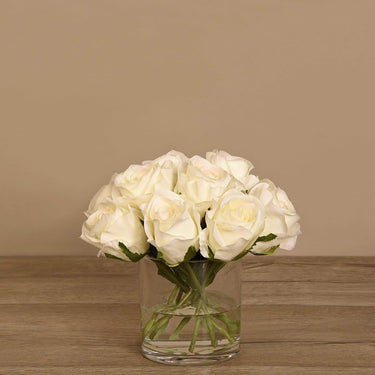 تشكيلة ورود صناعية في مزهرية زجاجية