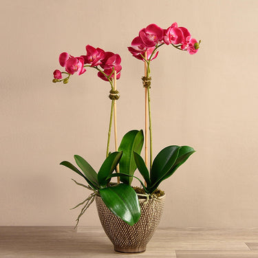 تشكيلة زهور الأوركيد المثالية لمحبي الديكور البسيط والمستوحى من الطراز الريفي الغربي الساحر. تشتمل هذه التشكيلة على زهور أوركيد كلاسيكية من أجود خامات الحرير، منسقة داخل أصيص سيراميكي بديع بنقوش بارعة، ليصبح الناتج النهائي تحفة فنية لا ينتهي سحرها أبداً.