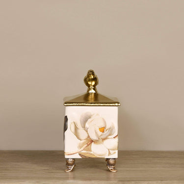 نعومة ورقة، بروح عصرية. يتميز هذا الصندوق المربع بتصميم كلاسيكي يُظهر زهور الفاوانيا البديعة بألوان هادئة مع لمسات باللون الذهبي وغطاء قابل للإزالة يجعله عمليًا في أغراض التخزين. هذا الصندوق سيكون إضافة مثالية لمنضدة حمامك، أو أي مكان آخر تفضلينه في منزلك.
