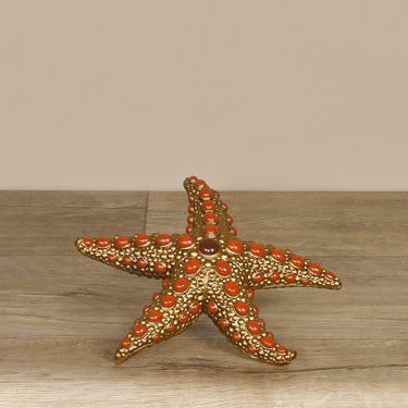 استمتع بأجواء البحر المنعشة داخل منزلك! قطعة ديكور فريدة على شكل نجمة بحر بلون ذهبي فاخر ولمسات باللون البرتقالي. يمكنك استخدامها كثقل لتثبيت الأوراق على مكتبك أو لتزيين أحد الأرفف في غرفة معيشتك.