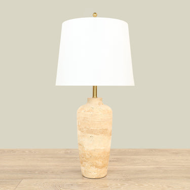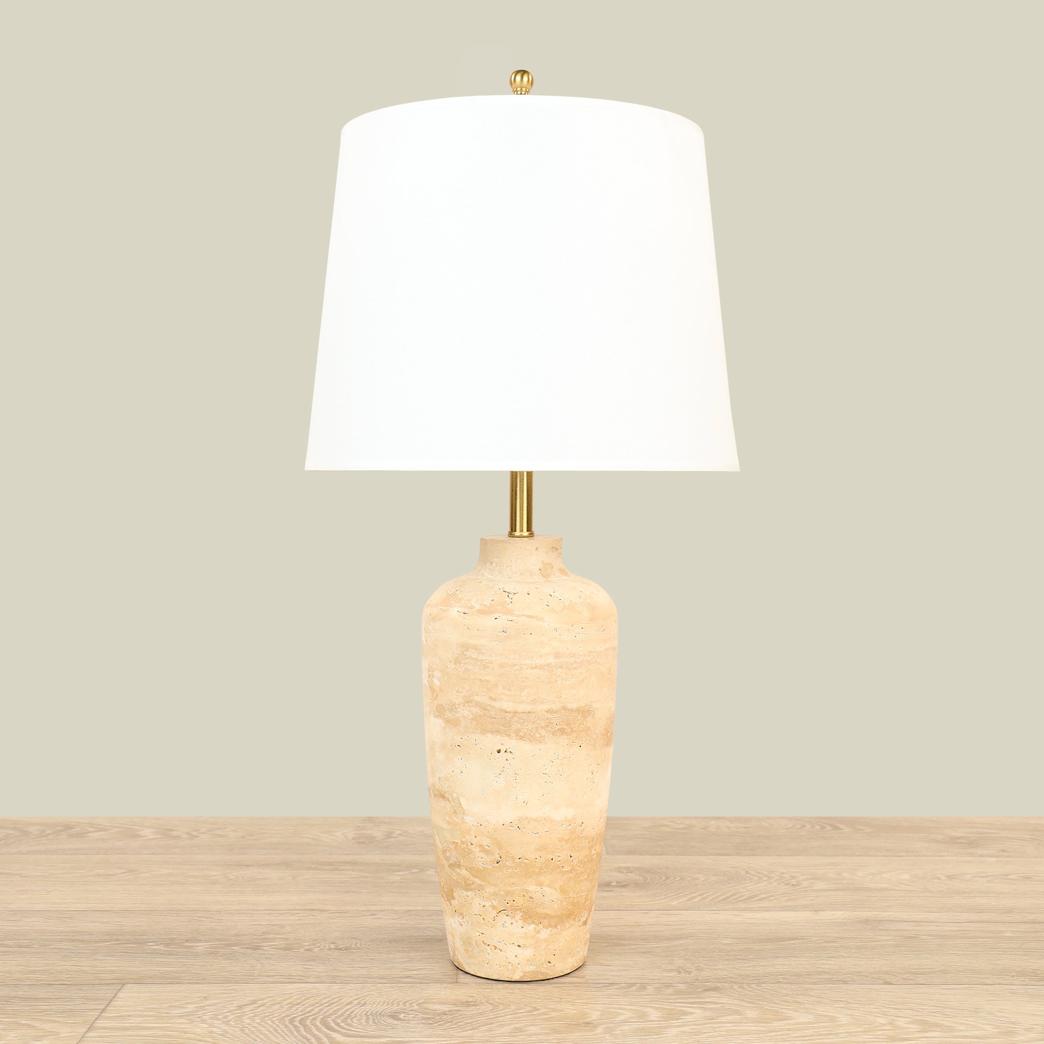 Discover understated luxury with this distinguished table lamp, showcasing a crisp white shade atop a warm yellow stone base.
