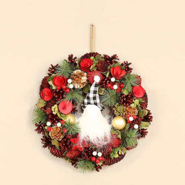 يُضفي هذا الإكليل الجميل لمسة من البهجة والسحر على ديكور منزلك في موسم الأعياد. يتميز بتصميم غني بالأزهار الصناعية وأقماع الصنوبر والخضرة الكثيفة، ليعكس أجواء الموسم بأناقة طبيعية. يتوسطه قزم لطيف بلحية بيضاء يرتدي زيًا بنقشة المربعات الحمراء والسوداء، ليمنحه طابعًا دافئًا ومرحًا. مثالي لخلق أجواء احتفالية مفعمة بالدفء والود، حيث يجمع هذا الإكليل بين السحر الريفي وروح العيد المرحة ليكون إضافة لا تُقاوم إلى منزلك.